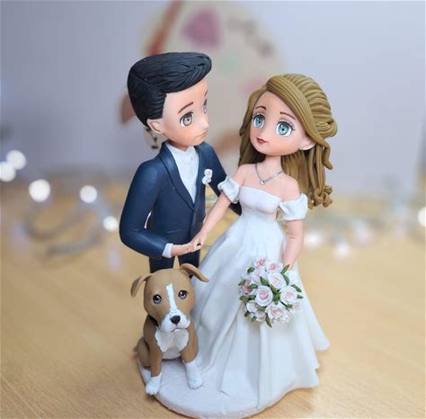 Bride And Groom With Dog And Cat - Wedding Cake Topper - Custom Wedding Clay Figurines & Wedding Keepsake - Customized