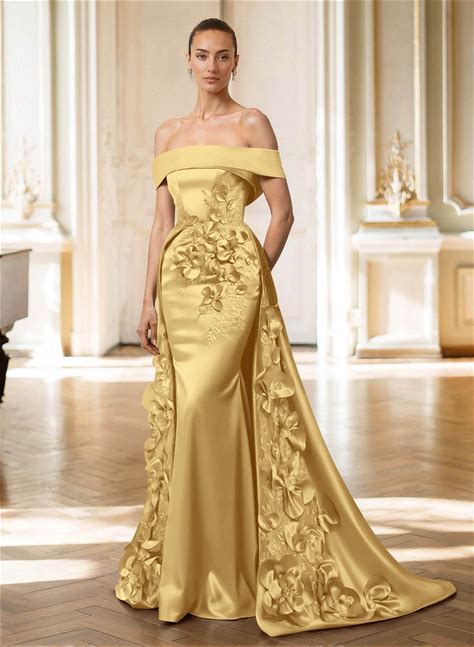 Missacc Gold Mother Of The Bride Dresses Trumpet/Mermaid Off-The-Shoulder Sweep Train Satin Mother Of The Bride Dresses With Overskirt Dress